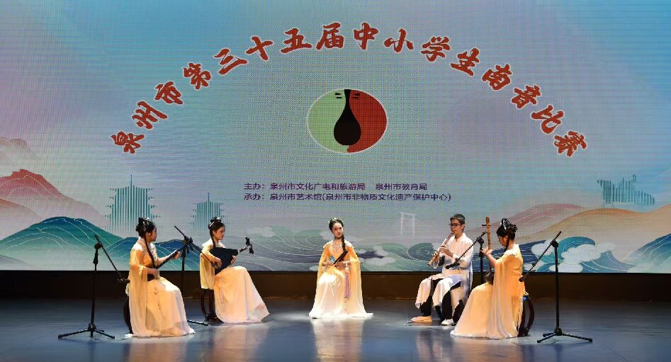 2025年8月4日至5日,由泉州市文化广电和旅游局、泉州市教育局联合主办,泉州市艺术馆(泉州市非物质文化遗产保护中心)承办的泉州市第三十五届中小学生南音比赛,在泉州非物质文化遗产馆二楼小剧场鸣锣开赛并圆满收官。经过各县(市、区)初赛选拔,共有38名小学生、21名中学生分别参加演唱组决赛,12支代表队60人参加演奏组决赛。经过两天的激烈角逐,最终评出了中小学演奏组、小学演唱组、中学演唱组一、二、三等奖以及优秀组织奖若干,泉港区代表队获得了器乐组第三名。